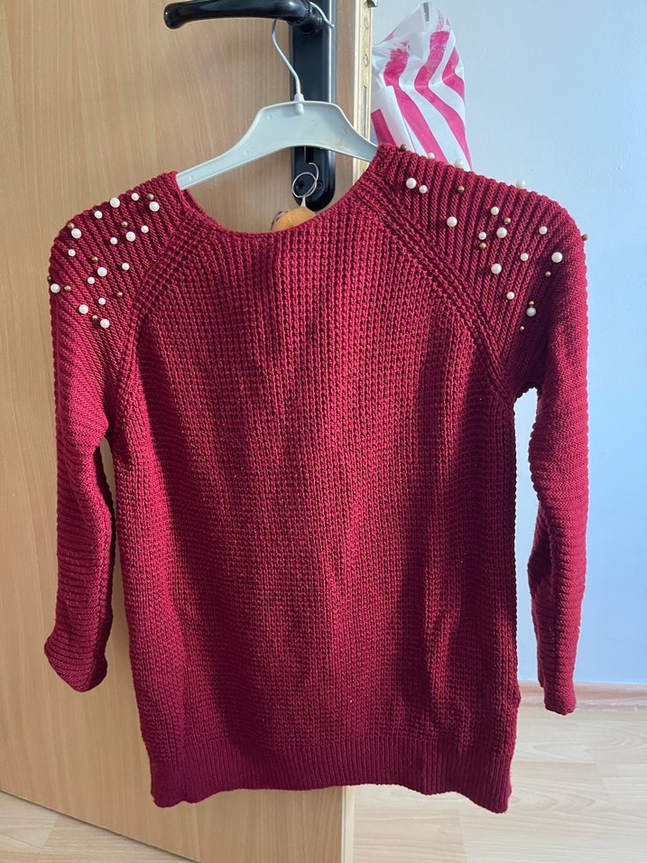 Bordo renkli, inci detaylı örgü kazak. Uzun kollu, bisiklet yaka ve midi boyda, rahat kesim ile günlük sokak stiline uygundur.
