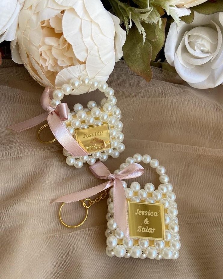 30 TL içerinde çikolatasi mevcuttur. altın pastel renkli inci detaylı, klasik Parisyen bohem tarzda kadın anahtarlık. Zarif kurdele ve isim yazılı plaka içerir.