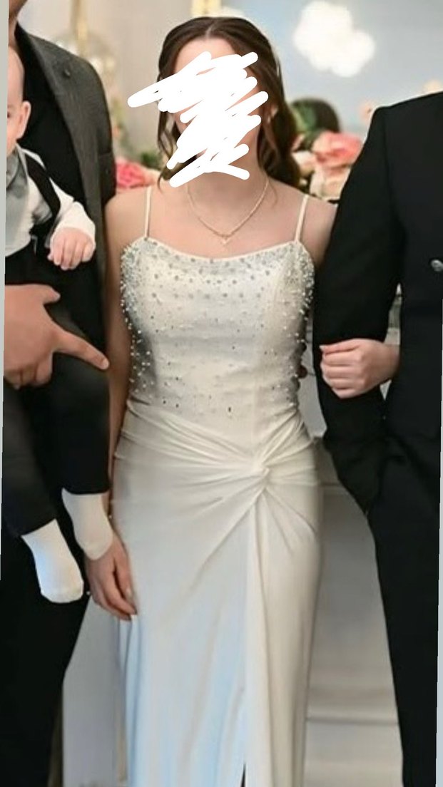 İnci detaylı, drapeli beyaz midi abiye elbise, ince askılı ve modern klasik tarzda, özel günler için uygun.