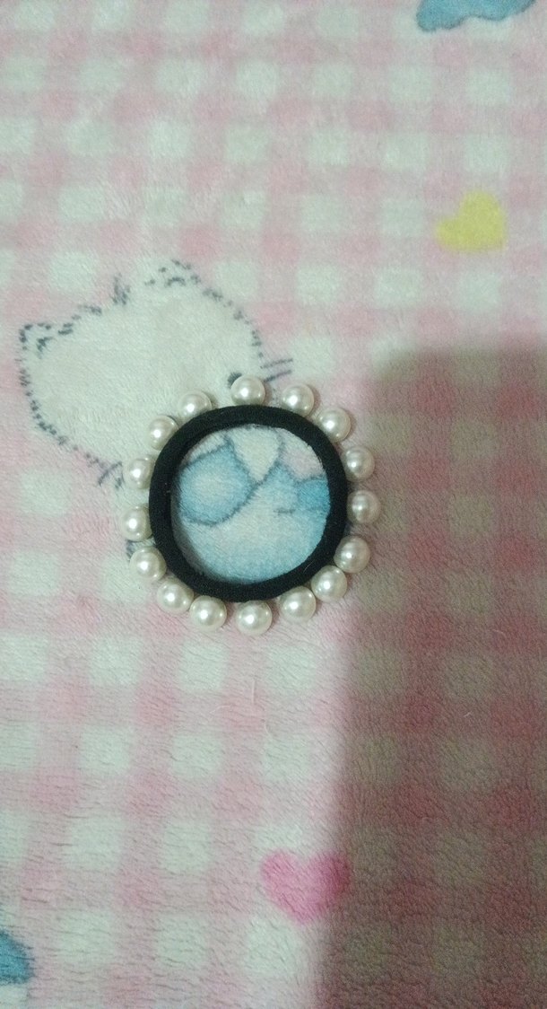 Yumuşak kürkten yapılmış, inci detaylı beyaz elastik saç tokası, pastel tonlarda vintage ve karşı kültür tarzında.