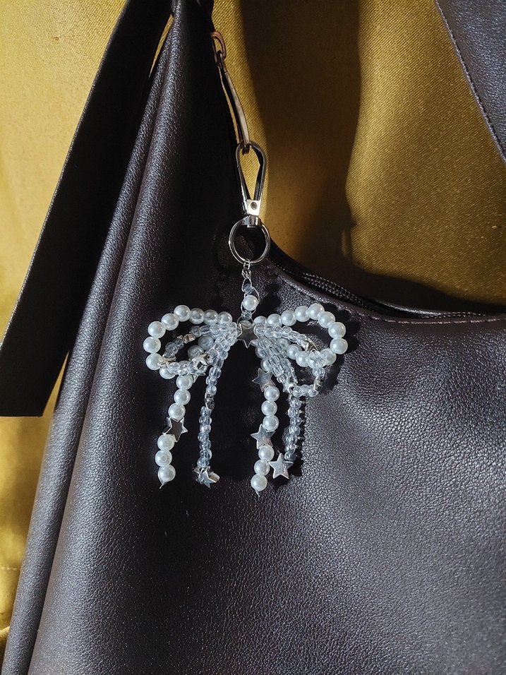 İnci ve şeffaf boncuklardan yapılmış fiyonk şeklinde anahtarlık. Gotik tarzı ve klasik zarafeti birleştirir. El yapımıdır.