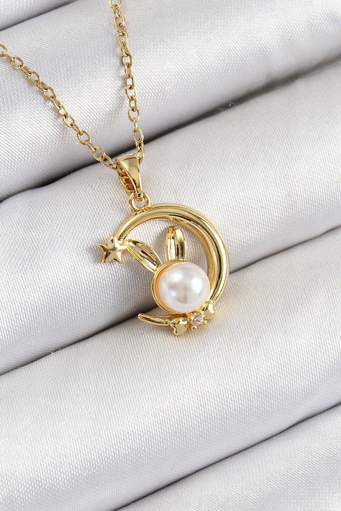 İnci detaylı ay ve yıldız figürlü gold zincir kolye, romantik akşamlar için ideal bir seçimdir.