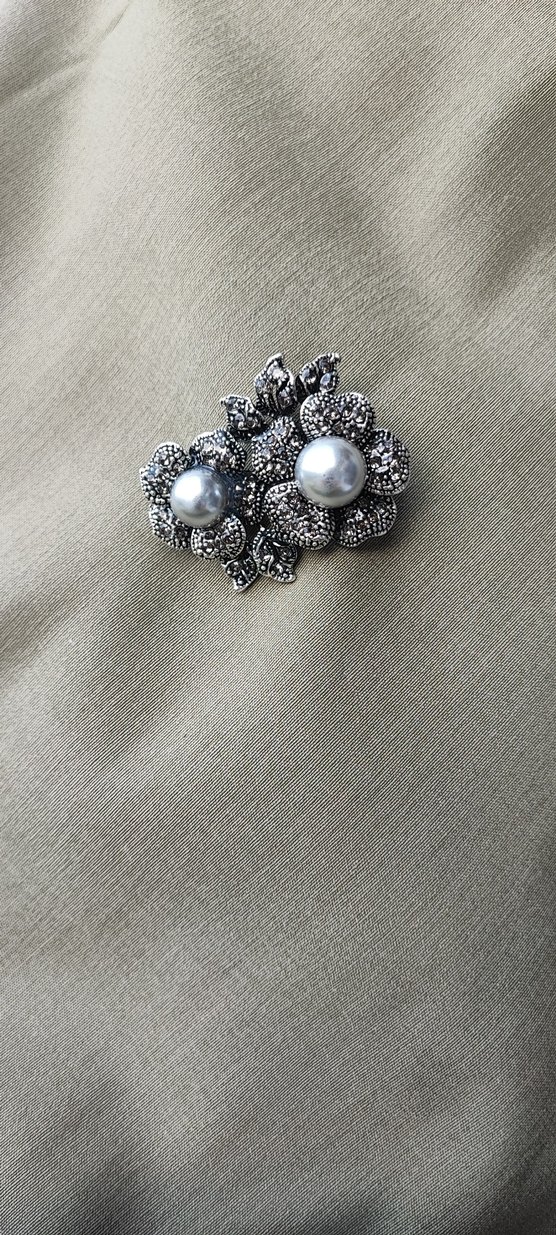 Gri renkte, boncuk işlemeli ve inci detaylı çiçek desenli vintage broş, modern klasik tarzıyla düğünler için uygundur.