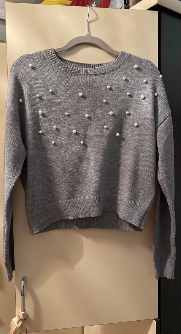 Gri renkli, yuvarlak yakalı ve uzun kollu örgü kadın kazak. Önde inci detayları ve bol kesimi ile rahat kullanım sağlar.