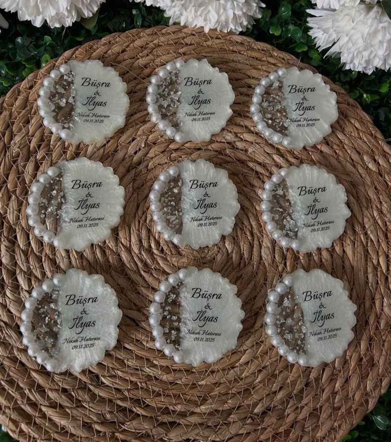 İnci detaylı, kişiye özel yazılı bej hediyelik magnetler. Zarif dalgalı kenarlara sahiptir. adet fiyatı 15 TL dir
