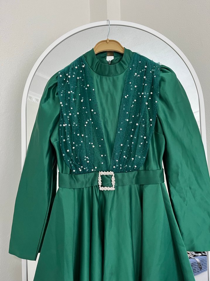 Uzun kol, kemerli ve inci detaylı işlemeli üst kısmıyla klasik şıklık sunan yeşil abiye elbise. Düğünler için uygundur.