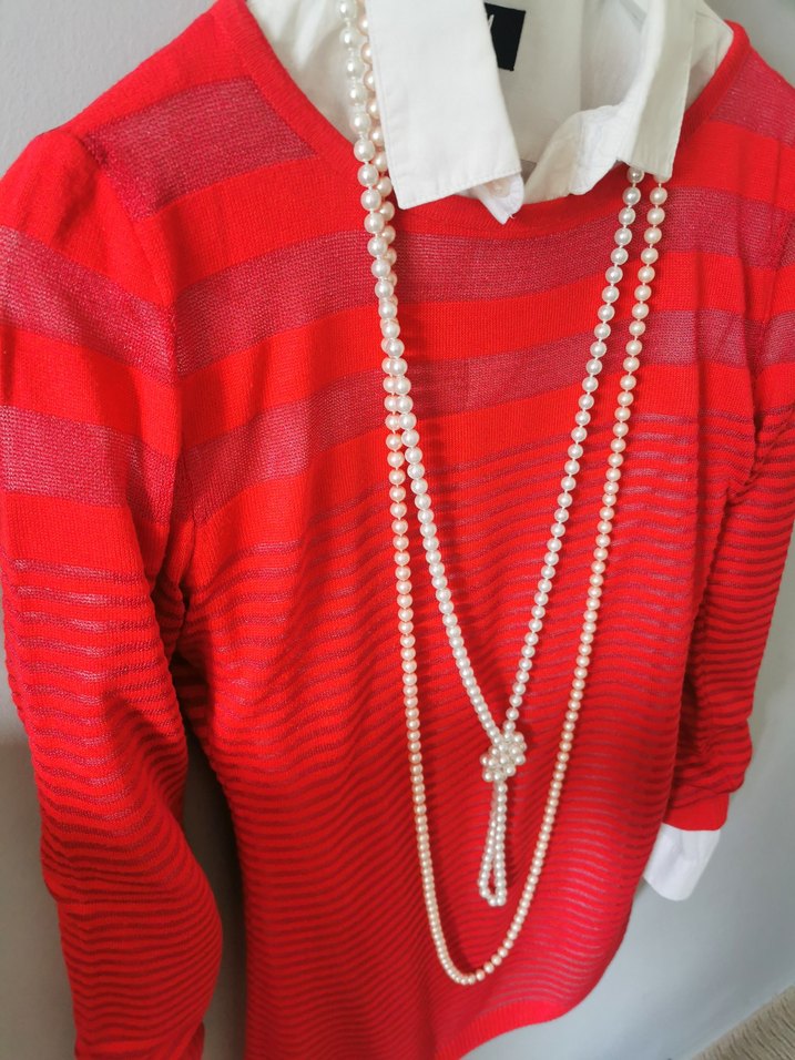 Yakalı, uzun kollu, pamuklu kırmızı çizgili ve inci detaylı kadın kazak. Modern klasik tarza uygun, günlük kullanıma ideal.