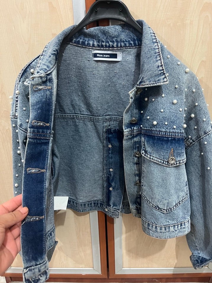 Kısa kesim, fitted mavi denim ceket, yakasında kesik detay ve düğmeli ön kısmı bulunur. Nakışlı inci detaylarıyla günlük kullanıma uygun, trend sokak stili ceket.