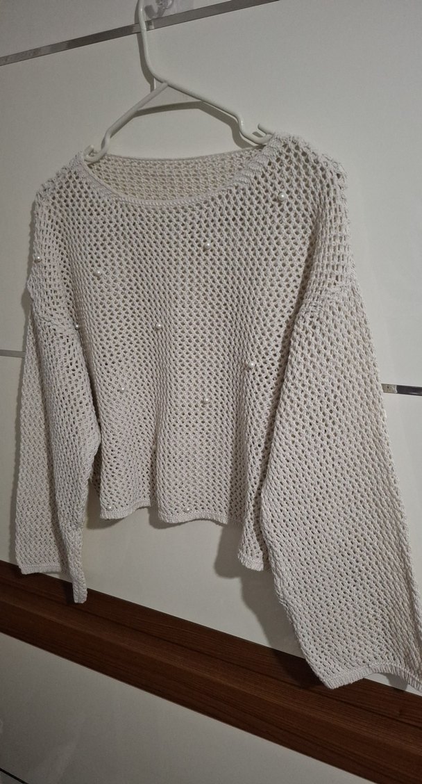 İnci detaylı. Krem tonlarında, uzun kollu, gevşek kesim ve tek renk örgü kadın kazak. Midi boyda ve sade tasarımıyla günlük rahatlık sağlar.
