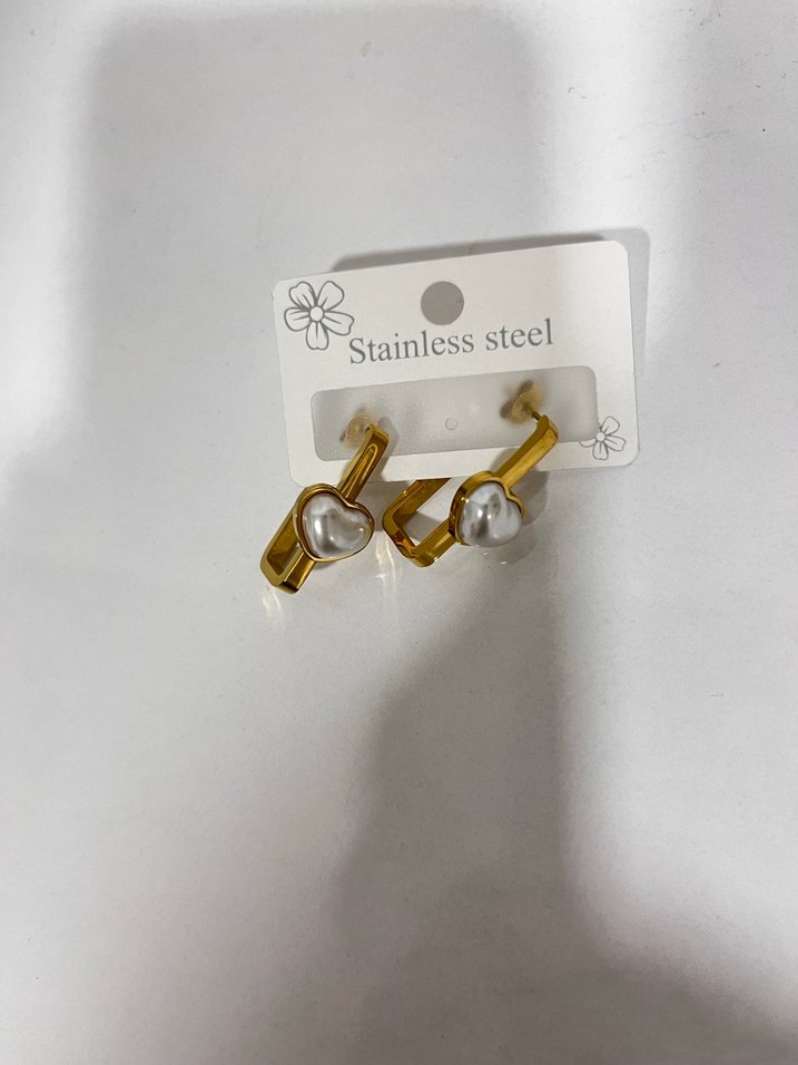 Parlak altın renkli, tokalı ve inci detaylı kısa uzunlukta kadın küpe. Çelik ürün .