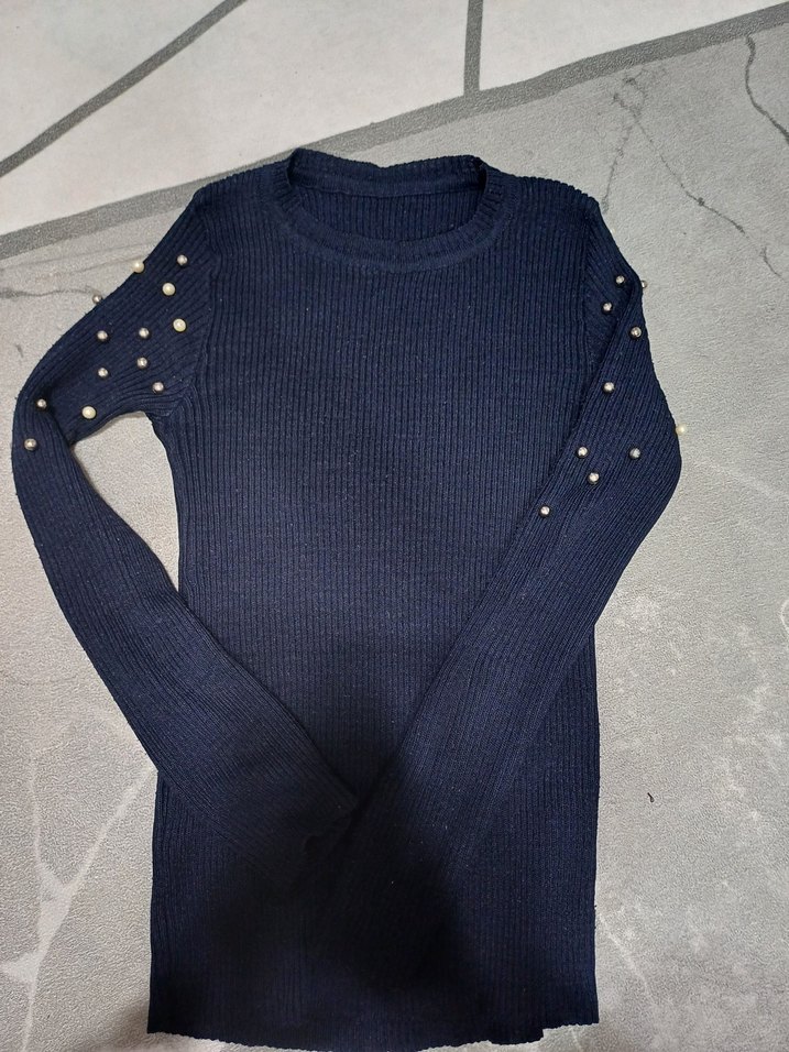Uzun kollu, inci detaylı lacivert triko kazak. Balıkçı yaka ve normal midi boyda, günlük kullanıma uygun rahat bir model.