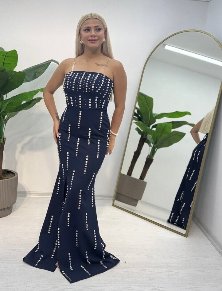 Lacivert renkli, askılı ve inci işlemeli puantiyeli uzun abiye elbise. Klasik ve çağdaş tarzda, romantik akşamlar için uygun. ✨