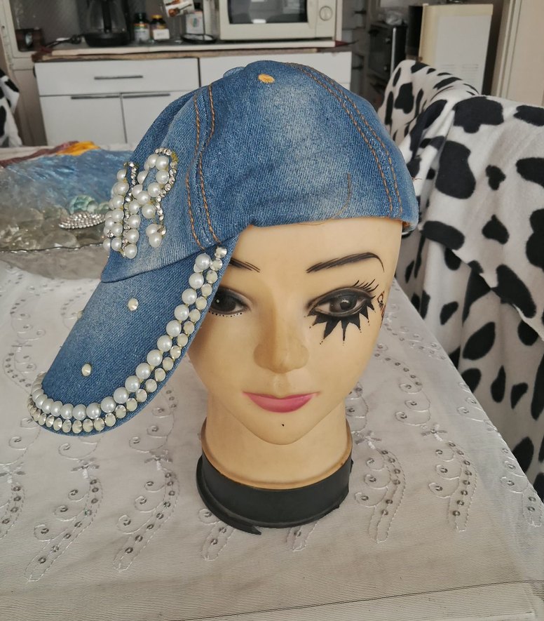 mavi kot kumaştan, inci detaylı ve payetli kadın şapkası. Avangart ve bohem tarzda bir tasarım. ✨
