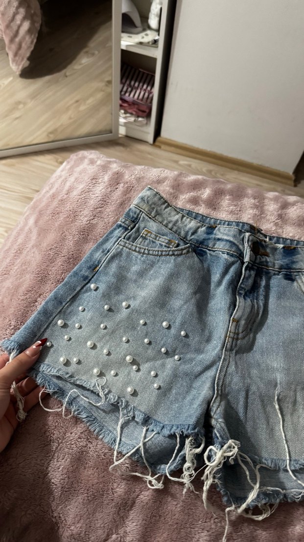 Mavi denim mini şort, bol kesim ve nakışlı desenlerle süslenmiş. İnci detaylarıyla sokak stiline uygun, günlük kullanıma ideal.