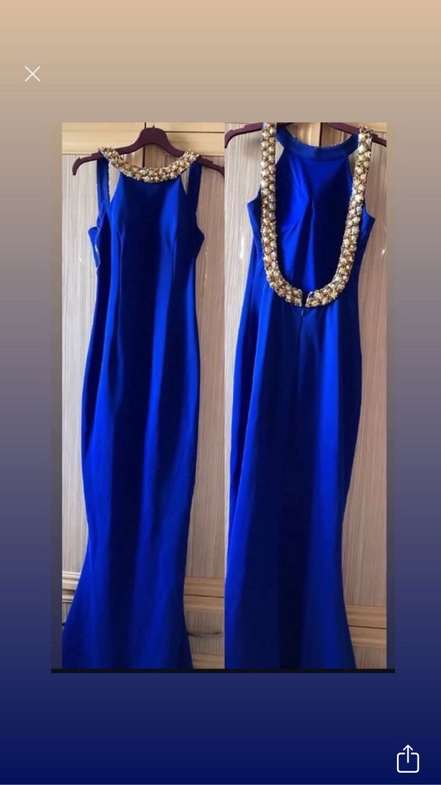 Mavi uzun abiye elbise, ince oturan kesimi ve boncuk işlemeli tekne yakası ile dikkat çeker. Kolsuz ve parlak yüzeylidir, şık davetler için uygundur.