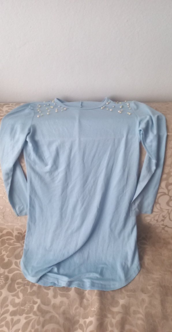 Yumuşak pamuktan yapılmış, ince mavi uzun kollu kadın tişörtü. Salaş kesim, yuvarlak yaka ve omuzlarda inci detayları bulunur. Günlük kullanıma uygundur.