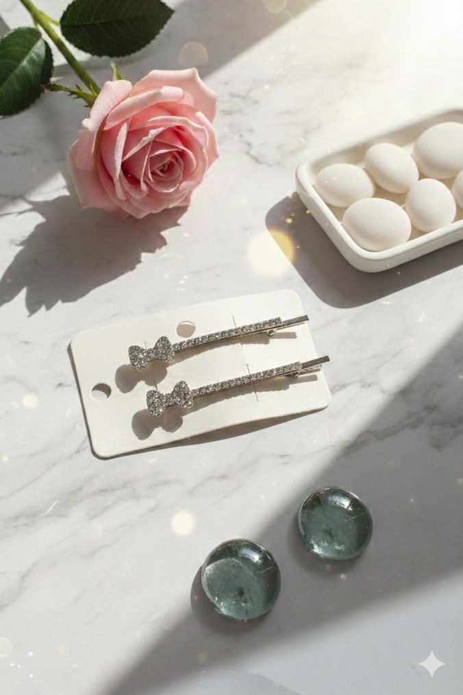 Minimalist tarzda, seramik tabanlı ve payetli kelebek detaylı beyaz toka çifti.