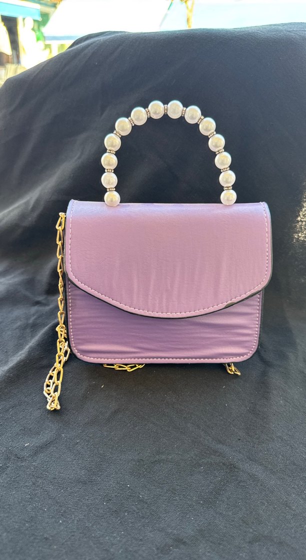Mor renkli, ipeksi dokulu kadın çantası, inci detaylı sapıyla parlak bir görünüm sunar. Klasik zarafet ve Paris sokak modası tarzını yansıtır.