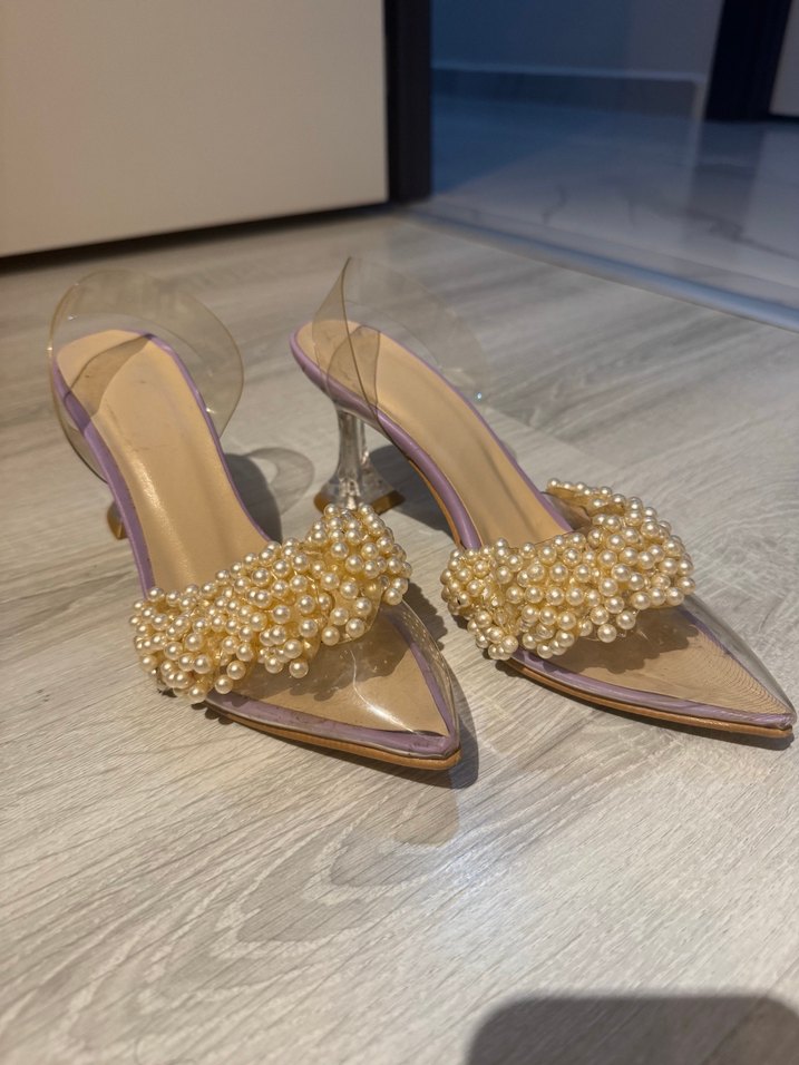 Mor cam malzemeden yapılmış, incili çiçek desenli bantlı stiletto topuklu kadın abiye ayakkabı, düğünler için şık ve çağdaş tarzda.
