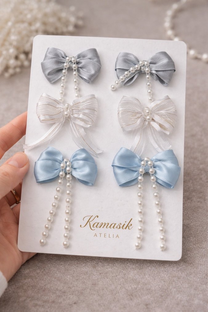 Nakışlı ve inci detaylı pastel renklerde fiyonk tokalardan oluşan set, bohem ve klasik şıklık sunar. Çocuk saçlarına zarif dokunuşlar katar.