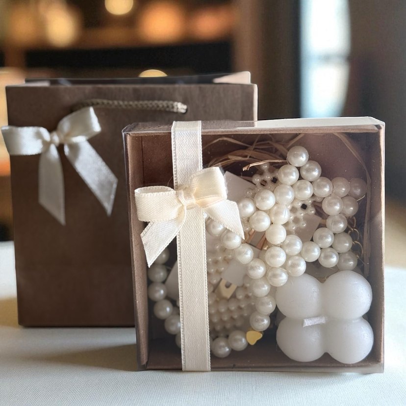 Kraft kutuda kutunun içinde inci bileklik, inci anahtarlık, inci çıt çıt toka ve bubble mum vardır.