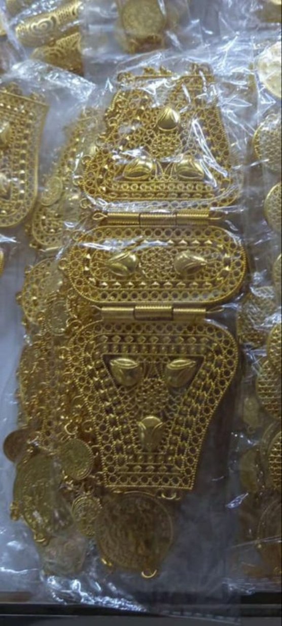 Parlak altın renkli, plastik boncuk detaylı kadın kemeri. Geleneksel tarzda, gösterişli ve zarif bir tasarıma sahiptir. ✨