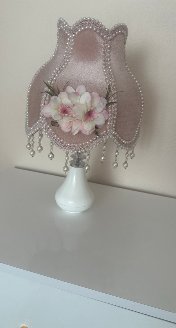 İnci detaylı ve çiçek süslemeli pastel pembe abajur, beyaz tabana sahiptir. 2 adet fiyatıdır