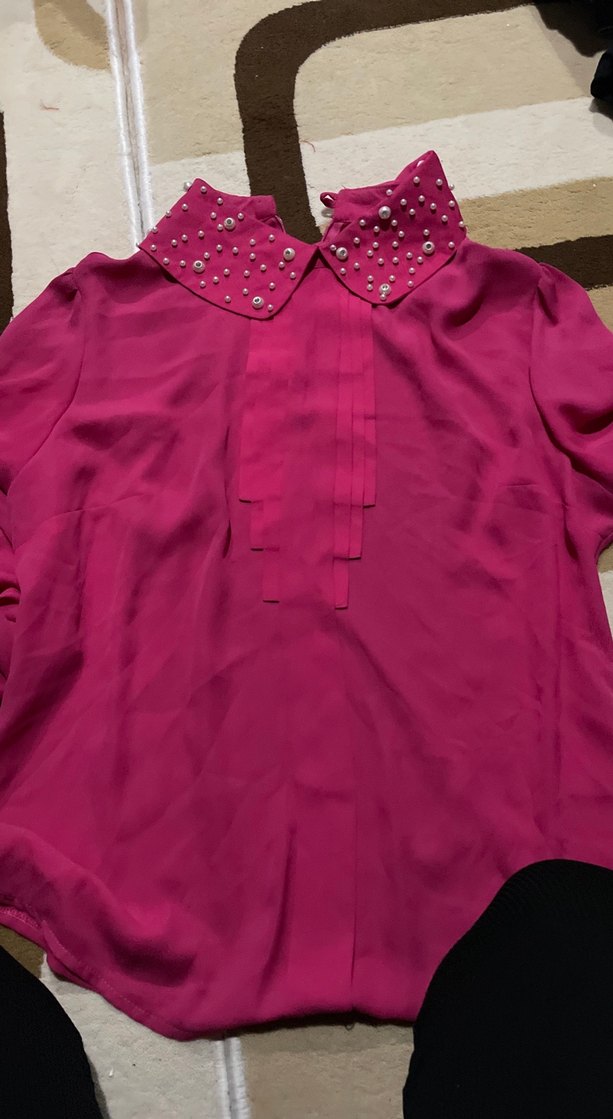 İnci detaylı yakası ve düğmeli önü olan, parlak pembe renkli, ipeksi kumaştan üretilmiş, bol kesim kadın gömleği. Uzun kollu ve normal boyda, günlük sokak modasına uygun.