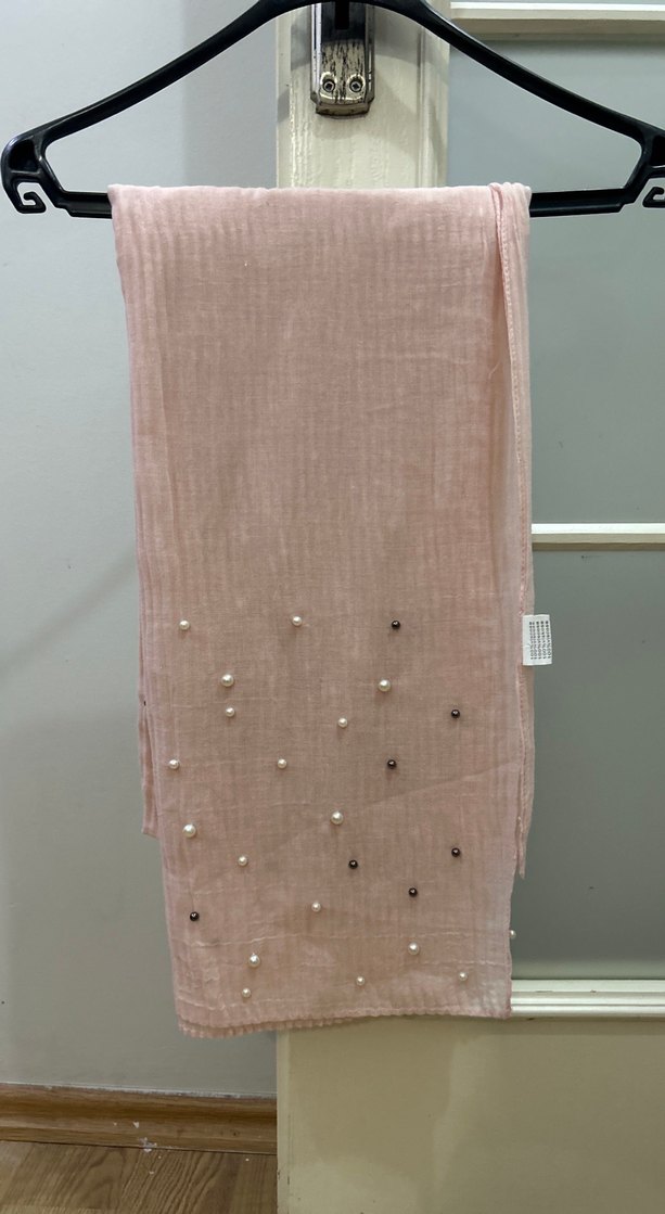 Pastel pembe keten kumaştan yapılmış, inci detaylı kadın şalı. Rahat ve bohem tarzıyla sade ve kullanışlıdır.