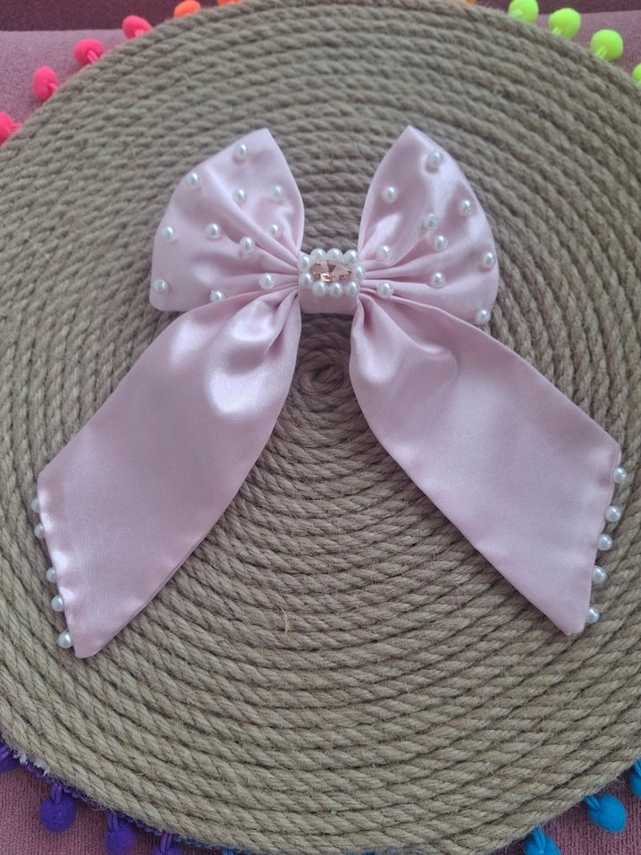 İnci detaylı, pastel pembe renkli örgü kumaştan yapılmış klasik zarafette ve geleneksel tarzda fiyonk.
