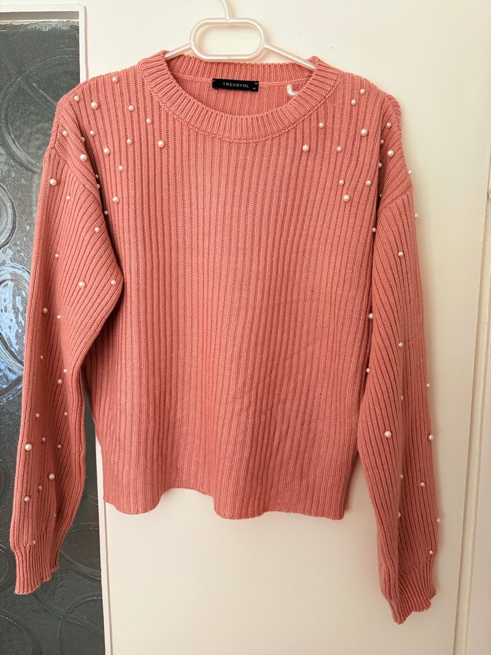 Trendyolmilla marka, Pudra renkli, uzun kollu ve yuvarlak yaka örme kazak. İnci detaylarıyla süslenmiş, normal boyda, rahat sokak stili için uygun. Birkac kez giyildi herhangi bir sorunu yok. Normal kesim
