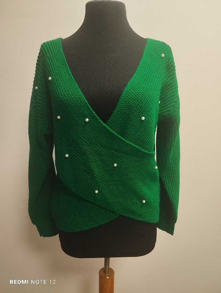 İki kol arası göğüs ölçüsü 55 cm. boy ölçüsü omuzdan arka 55 cm ön yaka ortasından 45 cm sargı kısmının geçiş yeri. Gayet şık. Hediye geldi tarzım değil. Omuzları açıkta kullanabilirsiniz. Suni inci detaylı,etiketi yok 38-46 bedene uygun, hafif esnek, %100 Akrilik.