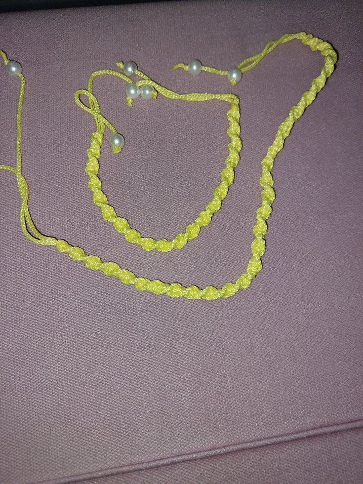 İnci detaylı sarı nakışlı kadın el zinciri ve kolye renkli bohem tarzıyla günlük kullanıma uygun. ✨