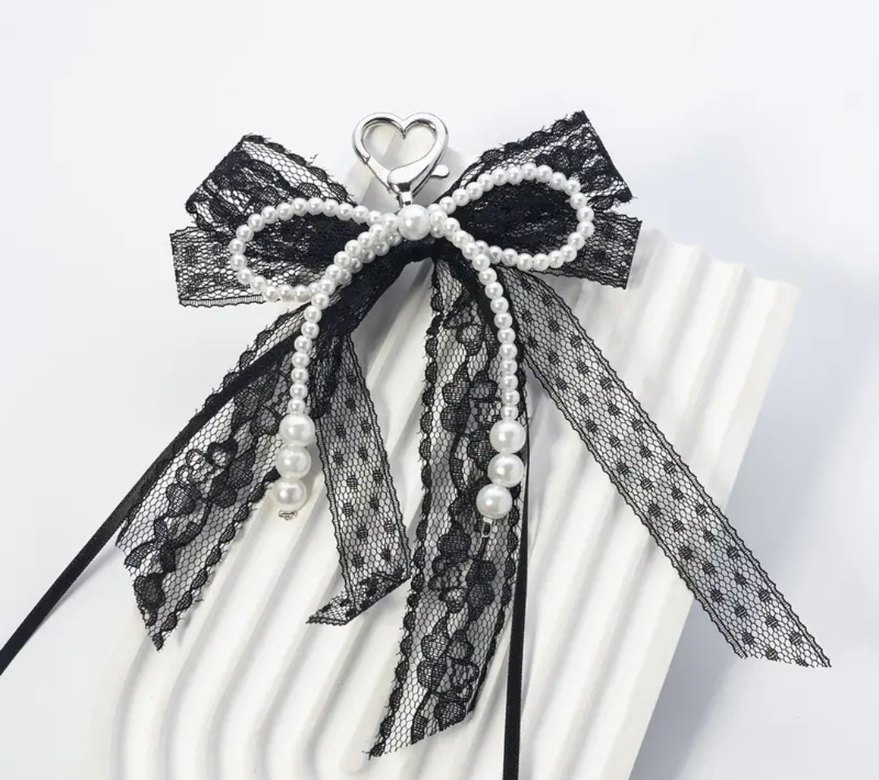İnci Detaylı Siyah Dantel Fiyonk çanta süsü