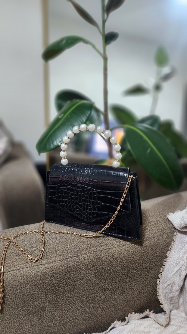 Parlak yılan desenli siyah deri çanta, inci detaylı kulpu ve altın zincir askısıyla klasik ve çağdaş bir şıklık sunar. Günlük kullanıma uygundur.