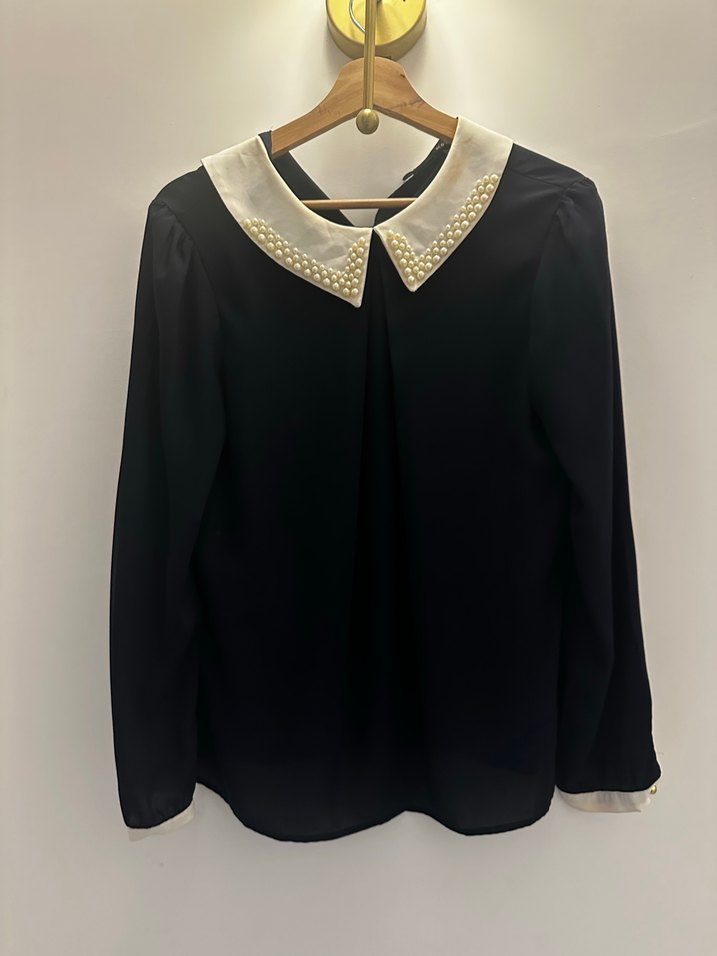 İnci detaylı beyaz yakalı, siyah uzun kollu, düğmeli, bol kesim, ipeksi dokulu gömlek. Ofis için uygun klasik şıklık sunar.