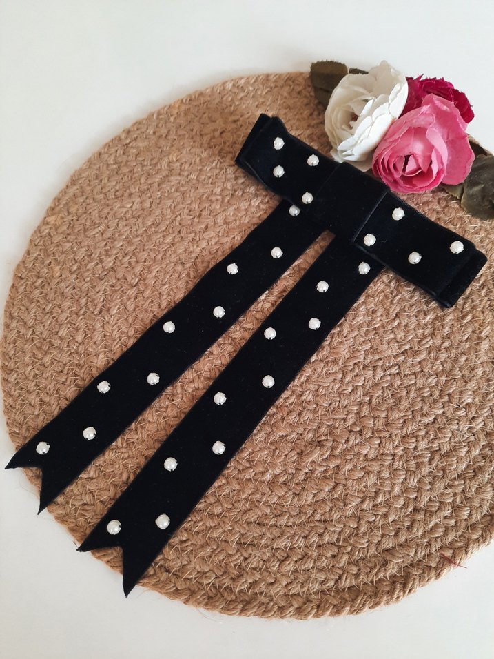 İnci detaylı siyah kadife fiyonk, gotik ve bohem tarzınıza zarif bir dokunuş katıyor.