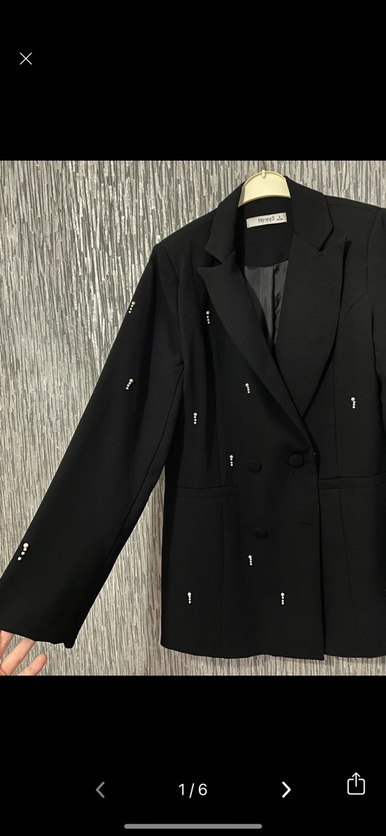 Siyah kadın blazer ceket, kesik yakalı ve düğmeli, inci detaylı. Uzun kesim ve regular fit defosu yok çok iyi durumda bir kere kullanıldı