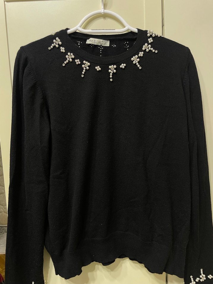 İnci işlemeli yuvarlak yaka ve uzun kollu siyah triko, rahat kesim ve normal boyda, günlük kullanıma uygundur. Ekol marka muadildir