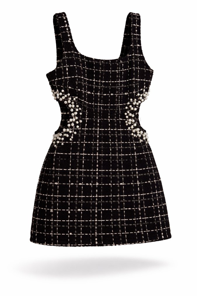 Kareli, kolsuz ve inci detaylı siyah midi elbise. Tekstil kumaştan, tekne yaka ve vücuda oturan kesime sahip, romantik akşamlar için uygundur.