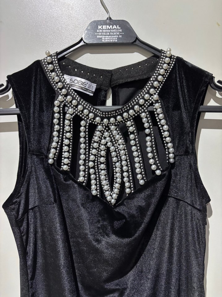 Kadife Elbise İnci Detaylı Siyah