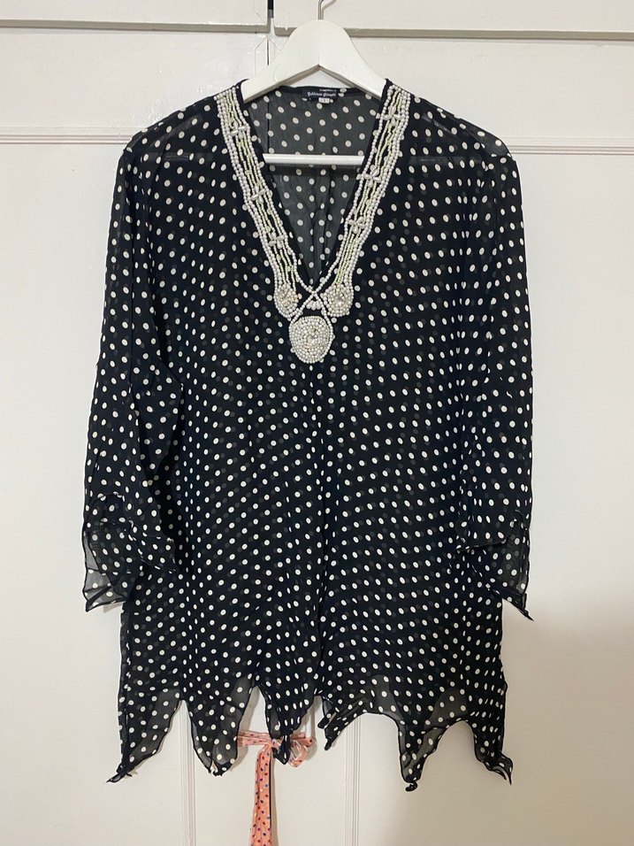 Siyah puantiyeli, V yakalı, inci detaylı, dirsek kollu ve midi boyda bol kesim bluz. Günlük kullanıma uygun yumuşak dokulu kumaştan üretilmiştir. Yıldırım güngör markadır.