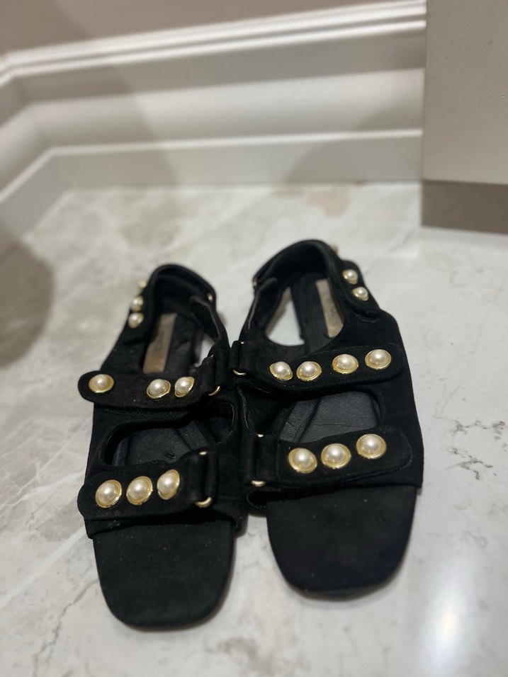 Siyah süet kadın sandalet, blok topuklu ve tokalı, inci işlemeli detaylara sahip. Günlük sokak modasına uygun Paris tarzı şıklık sunar.