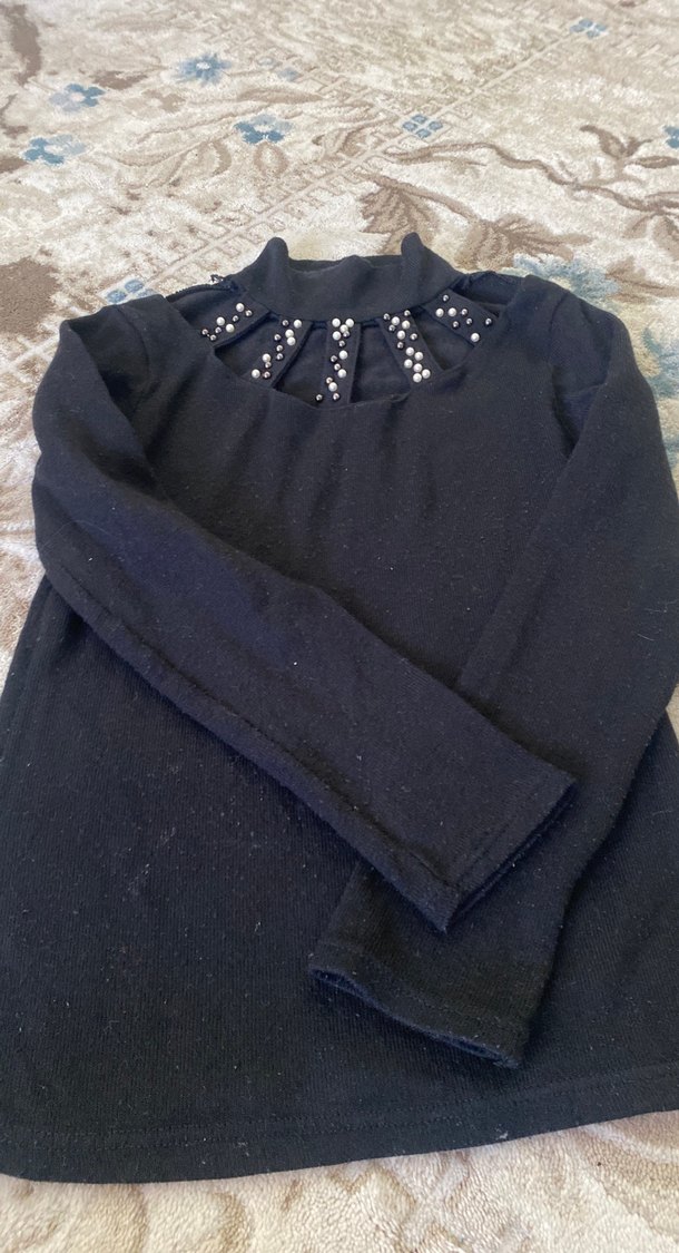 İnci detaylı, siyah triko kadın kazak, bisiklet yaka ve uzun kolludur. Günlük kullanıma uygun, rahat ve şık gotik tarz sunar.