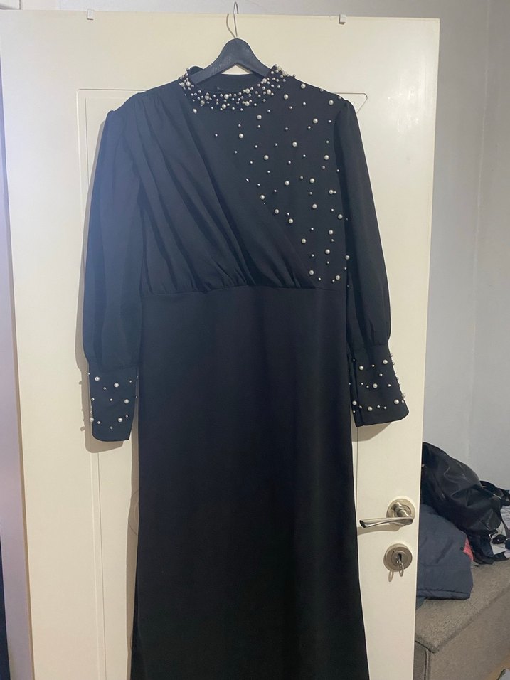 Yüksek yakalı, uzun kollu siyah abiye elbise, drapeli ve inci detaylarıyla sade ve şık bir Paris tarzı sunar. Düğünler için uygundur.