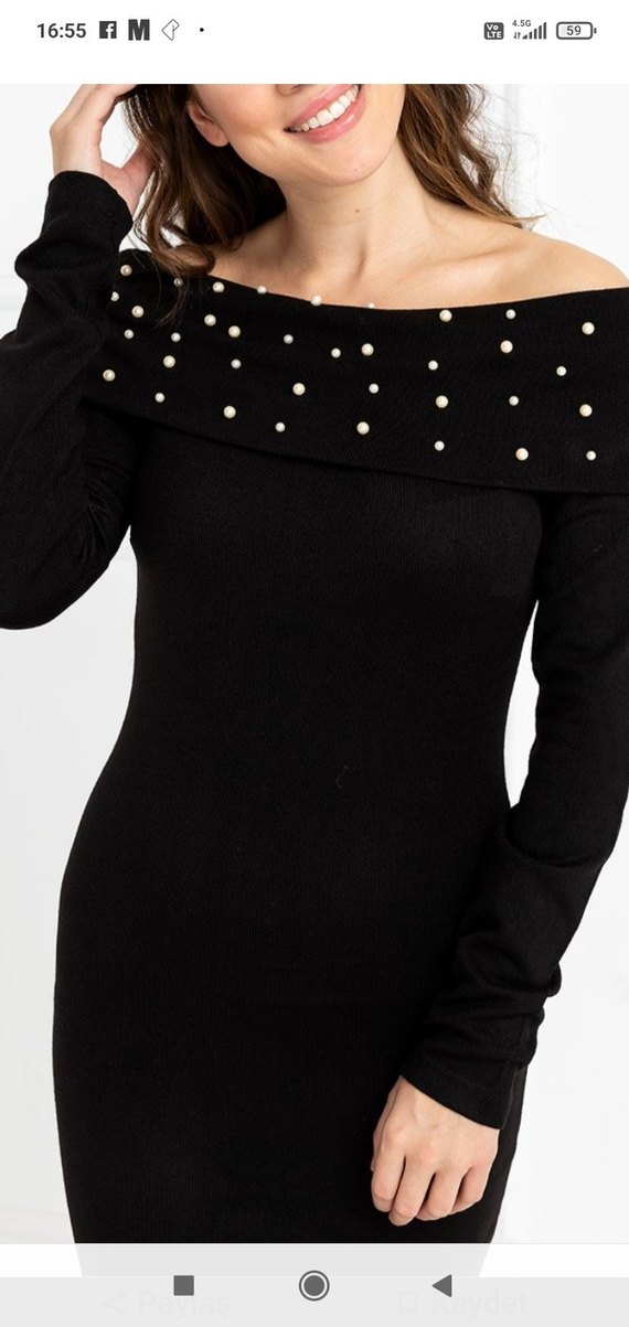 İnci işlemeli, tekne yaka ve uzun kollu, siyah fitted triko elbise. Yumuşak sentetik kumaştan, günlük kullanıma uygun.