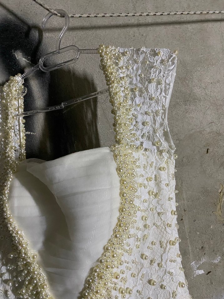 Bu beyaz A kesim gelinlik, straplez yakalı ve ince askılı, vücuda oturan bir modeldir. Gövdesi inci işlemeleriyle süslenmiş, uzun boyda bohem ve avangart tarzı yansıtıyor.