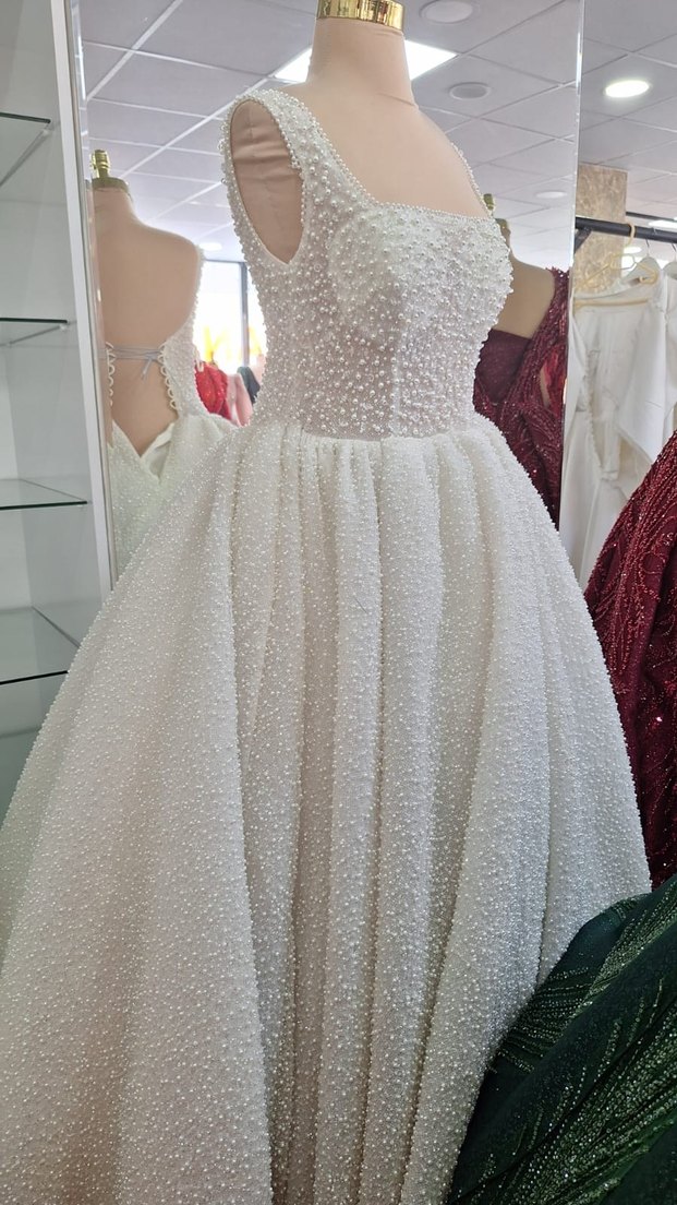İnci detaylı, straplez ve uzun etekli bu beyaz A kesim gelinlik, vintage dokunuşları modern zarafetle buluşturuyor.