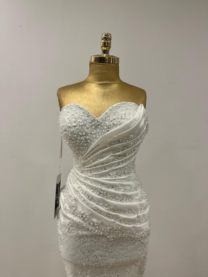 İnci işlemeli, straplez denizkızı kesim beyaz gelinlik, modern ve kolsuz tasarıma sahiptir.