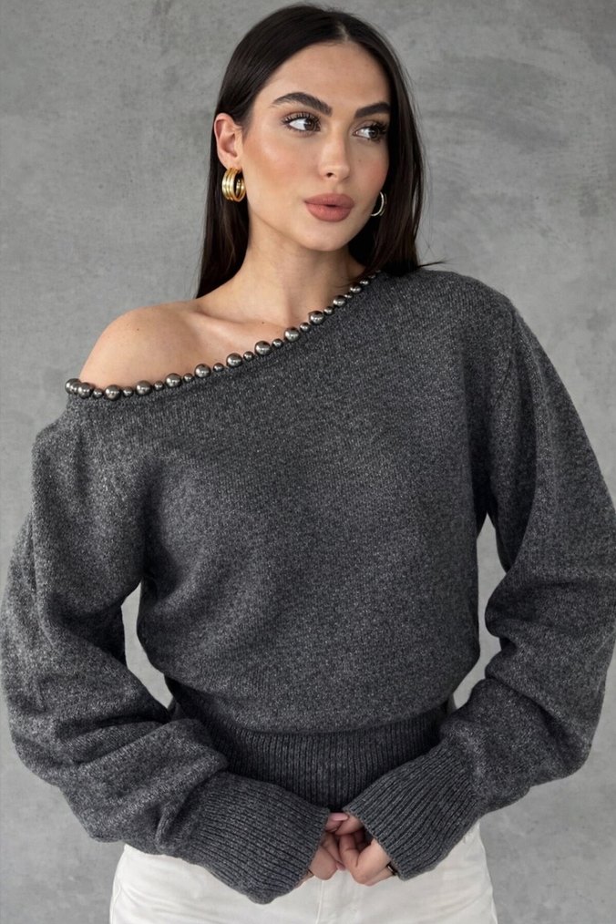 İnci Detaylı Tek Omuz Triko Kazak